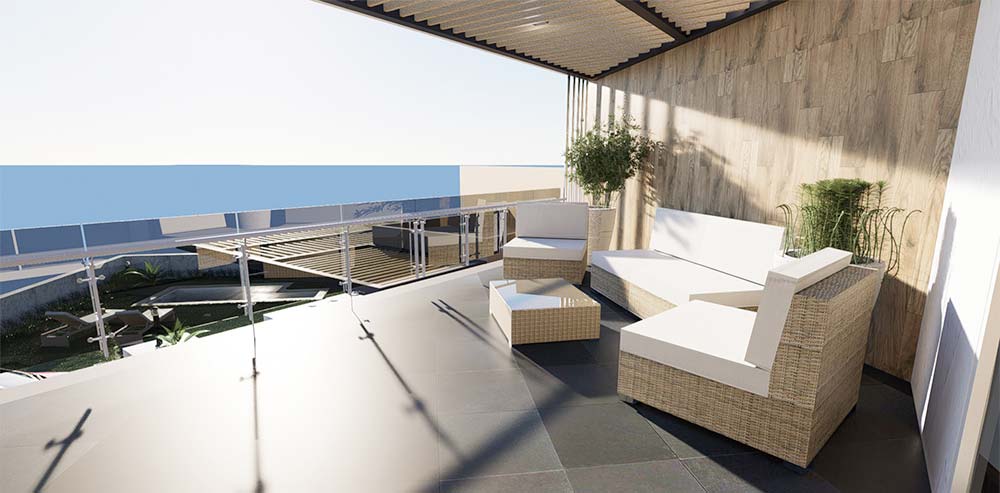 Patio escalonado con vista a la bahía, equipado con un área de quincho y terraza para actividades al aire libre.