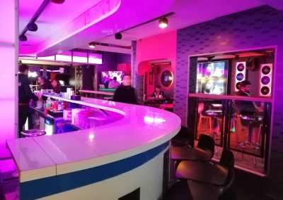 Área de Bar: El bar esta diseñado para ser el corazón del lugar, con una barra larga y sofisticada iluminada con luces LED y en 360º, ofreciendo una amplia selección de cócteles temáticos.